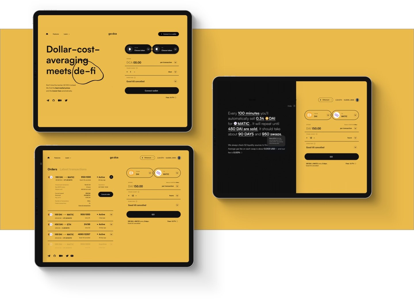 go:dca combines the best of traditional investment methods and blockchain technology into a decentralized financial tool. Built by investors, for users.